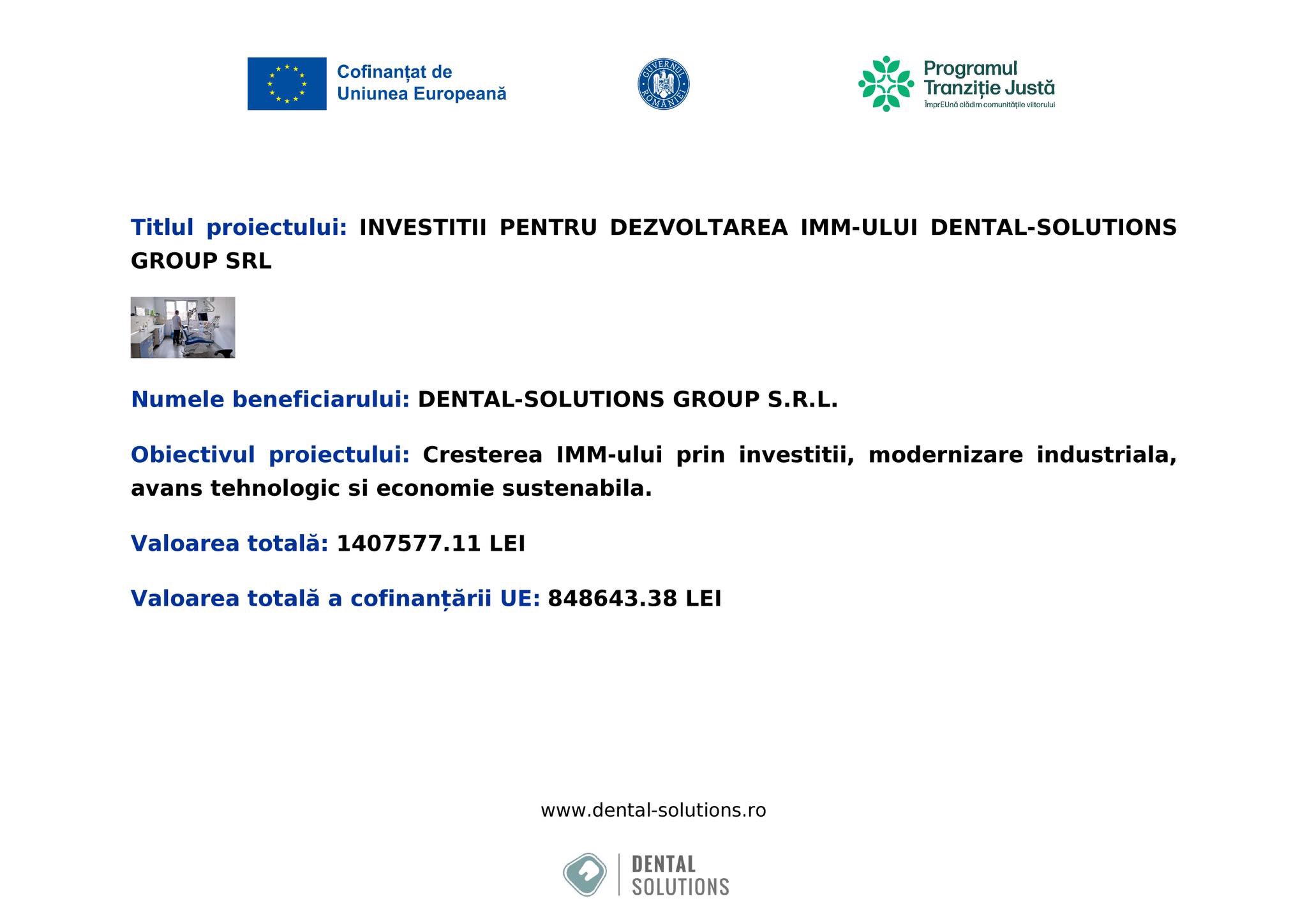 DENTAL-SOLUTIONS GROUP SRL, cu sediul în Municipiul Hunedoara, Str. Buituri, Nr. 39, județul Hunedoara, vă informează despre obținerea finanțării nerambursabile având ca obiectiv creșterea IMM-ului prin investiții, modernizare industrială, avans tehnologic și economie sustenabilă.